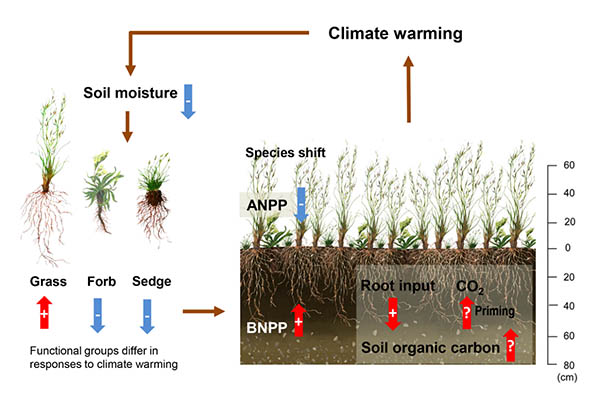 近50年来,青藏高原经历着两倍于全球平均的升温过程,同时降水格局也发生了显著的变化。剧烈的气候变化将如何影响高寒草地生态系统的结构和功能?其内在机制是什么?这些问题直接关系着高原5000万只藏系绵羊、1400万头牦牛以及大量野生有蹄类动物的生存与生长,与700万当地牧民的生产与生活紧密联系,一直为国内外研究者们所关注。为解答这些科学问题,科研人员需要克服高原恶劣的气候条件,进行严格的野外气候变化控制实验,因此工作难度极大。 银河集团9873.cσm贺金生教授课题组与中国科学院西北高原生物研究所等单位合作,于2011年在青海海北高寒草地生态系统国家野外科学观测研究站(简称“海北站”),建立了大型的“增温-降水改变”控制实验(图1)。通过野外实验,结合海北站连续32年的地面监测、以及青藏高原9个站点实验研究的整合分析,探讨了气候变化对高寒草地植物群落结构和生产力的影响。论文 “Shifting plant species composition in response to climate change stabilizes grassland primary production” 作为方精云院士组织的“Climate change, policy, and carbon sequestration in China”专题系列论文之一,于2018年4月17日发表在《美国国家科学院院刊》上(http://www.pnas.org/content/115/16/4051)。 研究发现,尽管过去32年以来海北站气候呈现暖干化的趋势,但草地生产力无显著趋势性变化。但是,32年间草地物种组成却发生了明显改变,即深根系的禾草增加、浅根系的莎草减少。这种功能群组成的变化增强了植物群落对深层土壤水分的获取能力,有利于气候变化下生态系统初级生产力的稳定。气候变化控制实验进一步证明,增温和干旱处理有利于光合产物向地下分配,但对总初级生产力无显著影响。整合分析证实了气候变暖条件下物种组成这种改变在整个高原普遍存在。这些结果表明,高寒草地植物多样性在气候变化下生产力维持过程中起着关键作用。更重要的是,发现高寒草地生态系统并没有从气候变暖过程中受益,这和以前的认识完全不同。 银河集团9873.cσm博士生刘慧颖为论文第一作者,贺金生为论文通讯作者。该研究得到了科技部 “全球变化研究国家重大科学研究计划” 、中国科学院先导专项、国家自然科学基金重点、面上等项目的资助。 贺金生课题组长期从事高寒生态系统对全球变化的响应与适应、高寒湿地温室气体排放及其对全球变化的反馈、以及高寒草地碳氮循环等方面的研究。课题组近五年对高寒生态系统的研究成果还发表在Nature Communications (2015, 6: 8159; 2017, 8: 15378), Global Change Biology (2017, 23: 815-829)等期刊上。 图1. 青海海北高寒草地生态系统国家野外科学观测研究站的长期监测样地以及大型 “增温-降水” 实验平台 图2. 高寒草地生态系统过程对气候变暖的响应及其对气候变化的潜在反馈。红色箭头(+)、蓝色箭头(-) 和红色箭头(?) 分别表示增加、减少和不确定
