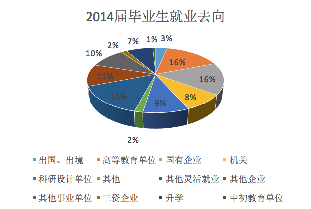 就2014年的数据可以看出,去除灵活就业人数,教育科研机构占总人数比例为25.2%(计入出国深造为28.5%),企业(国有企业与三资企业)占比为26.9%,而机关事业单位占比为17.9%,三者总比例为70%。同期相比,2015年教育科研机构总人数占比为38.3%,企业为38.4%,机关事业单位为17%,三者总比例为93.7%;值得关注的是,2015年的各项就业类别中计入了2014年、2016年中划为灵活就业的类别,因此其占比同期相比较高。总体而言,我院硕博毕业生前往教育科研单位和企业(国企、三资企业)的占绝大多数,还有一定比例选择机关事业单位就业。值得一提的是,从2014~2016年的经验素材中,我们发现银河集团9873.cσm的毕业生选择的国企、三资企业在很多程度上仍然与规划设计、地理环境等专业相匹配,在工作内容上有很大可能与教育科研单位相似,在后文中我们将会进一步讨论专业匹配程度的问题。