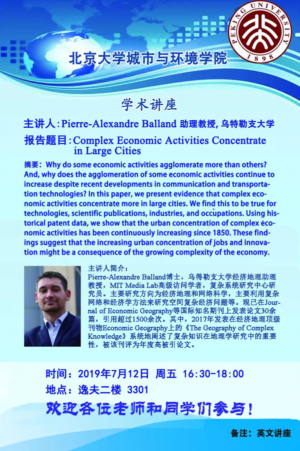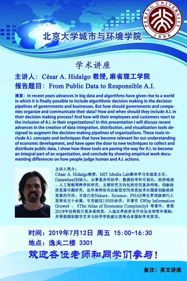 2019年7月12日下午,应贺灿飞教授和朱晟君研究员的邀请,乌特勒支大学的Balland助理教授和麻省理工学院Hidalgo教授在银河集团9873.cσm逸夫二楼分别带来题为“Complex Economic Activities Concentrate in Large Cities”及“From Public Data to Responsible A.I.”的精彩讲座。此次讲座由朱晟君研究员主持,有来自多校多院系师生参加,座无虚席,反响热烈。 讲座回顾一 主讲人:Pierre-Alexandre Balland 助理教授,乌特勒支大学 报告题目:Complex Economic Activities Concentrate in Large Cities 第一个报告介绍了“Complex Economic Activities Concentrate in Large Cities”这篇文章。该文由Balland教授与麻省理工的Jara-Figueroa、伦敦政治经济学院的Petralia、乌得勒支大学的Steijn、加州大学洛杉矶分校的Rigby以及麻省理工学院的Hidalgo合作完成。 报告关注经济活动的集聚现象,回答了为什么一些经济活动会比其他经济活动更聚集,并且随着通信和运输技术的发展,为什么一些经济活动的集聚持续增加等问题。报告的关键研究目标有二:一是理论框架的构建,基于发明专利的地理空间不均衡性,研究知识复杂性与空间不均衡之间的关系;二是实证研究,基于美国1790-2010年的专利数据,探究不同的工作、产业、专利和出版物在美国的空间分布差异。 Balland 首先展示了美国各城市的经济活动规模,发现以上四个方面(专利集中度、研究论文、产业和就业)的经济活动都高度集中,尤其是在大城市。 随后,Balland解释了如何通过度量知识的复杂性来解释城市经济活动的集中度,分别从技术、科学、产业和职业四个方面探究城市经济活动的空间集中度与其经济复杂性的关系。 基于美国1790-2010年发明专利历史的回顾发现,在1975年以前,几乎没有研究对创新和技术变革的地理空间分布进行历史和系统的分析。而基于1985-2010年历史数据的分析发现,复杂度高的技术(重新组合新知识的技术)倾向于往城市集中,并随着每次工业革命而加速。低复杂性专利的集中度一直低于高复杂性专利的集中度。对专利的六个主要类别分别观察,发现“机械”和“其他”技术在十九世纪中期集中在大城市,从1950年开始,“计算机和通信”以及“药品”专利不断集中并达到顶峰。这些结果均表明,城市专利活动的集中度呈现出长期循环现象,即在技术全盛时期上升,随着技术成熟而下降。 最后,Balland总结出知识复杂性推动了空间不均衡性的结论。在过去的200多年里,城市优势规模在不断增加,而高复杂性技术和行业的规模最大。但同时也存在两个值得思考的问题:这是否是我们观察到的巨大空间分布差异的开始?如何保证像智能专业化之类的战略政策不会增加这种空间“鸿沟”? 讲座回顾二 主讲人:César A. Hidalgo教授,麻省理工学院 报告题目:From Public Data to Responsible A.I. 在第二个报告中,Hidalgo教授回顾了他过去15年以来的研究工作。他的报告涉及四个方面:首先,如何通过机器学习以及AI来获取和匹配公开数据;其次,如何利用公共数据的数据分发系统为公众提供所需数据,Hidalgo教授同时展示了其信息挖掘开源工具研发团队自2011年至今的的应用成果;第三部分介绍了他对于经济复杂度和相关性的研究;最后,通过展示公众调查结果,探讨AI伦理问题,了解人们是如何看待人工智能的。 Hidalgo首先指出,公共和私人组织为了决策需要处理和分析多种大量数据,但是合并、匹配、可视化以及分析数据流的过程是非常昂贵的。机器学习和AI技术能够降低获取公共数据的成本,但其应用需面临四个方面的挑战。Hidalgo对如何解决数据整合的挑战、分配的挑战、分析的挑战和自动化的挑战进行了一一介绍。 随后,Hidalgo展示了其团队从2011年至2018年所开发的各种数据工具平台,包括Data viva, Data USA, Data Africa, Data Chile, Data Korea等,并展示了数据使用情况的变化。 在第三部分中,Hidalgo重点介绍了其关于经济复杂度和相关性的研究,包括:2007年Hidalgo等人发表在Science上关于相关性的研究;2009年Hidalgo和Hausmann在PNAS上发表的对于经济复杂度的研究及测度;2014年MIT出版社出版的相关研究书籍;2018年Hidalgo等人在第九届国际复杂系统会议上的相关性原理的研究;2018年Jara-Figueroa等人和Hidalgo对于产业、职业、位置及特殊知识对于初创公司生存影响的研究;2018年Alshamisi、Pinheiro和Hidalgo在Nature Communication上发表的关于相关产品最佳多样化战略的研究;以及Neffke、Henning、Boschma等人对产业空间的相关性研究等等。 最后,Hidalgo介绍了机器学习及深度学习的大量应用案例及其贡献,例如识别地点变化、辅助决策医院的新建、更新和选址等。此外,Hidalgo还重点介绍了他将于2020年发表的对于AI伦理问题的最新研究成果,讨论了人们对于人/机器人做同样一件事的不同态度。 报告后,现场听众与Hidalgo进行了热烈的互动提问。 两场汇报结束后,Hidalgo和Balland还与部分听众学生合影留念。 嘉宾简介 César A. Hidalgo教授,MIT集体学习实验室主任、Datawheel创始人,从事复杂性科学、数据科学和可视化、经济地理、人工智能等跨学科研究。主要研究方向包括空间复杂网络、创新经济发展问题研究,近年来特别关注新型空间信息技术对国家创新经济发展的作用。在经济地理领域的主要贡献是创建了路径依赖性及经济复杂性指标。目前已在Nature、Science、PNAS等世界顶级期刊上发表论文十余篇,引用超过15000余次,并著有《Why Information Grows