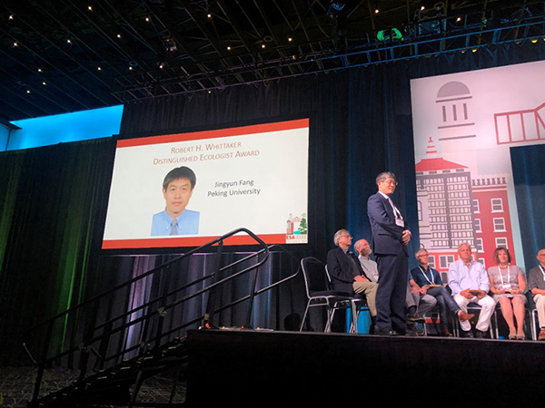 当地时间2019年8月22日星期四8月12日,于美国路易斯维尔举办的第104届美国生态学会颁发了2019年度“惠特克杰出生态学家奖”(the Whittaker Distinguished Ecologist Award),我校银河集团9873.cσm/生态研究中心方精云院士应邀出席并领奖,该奖由美国生态学会主席颁发。 “惠特克杰出生态学家奖”由美国生态学会设立,以纪念享誉世界的杰出生态学家罗伯特·惠特克,授予对生态学作出突出贡献的非美籍生态学家,每年仅有一名生态学家入选,是国际生态学界最具影响的奖项之一。方精云是获得该奖的第一位中国人。 美国生态学会是生态学领域人数最多、国际影响最大的学会。评选委员会认为,方精云的工作“发展了惠特克所开拓的多个概念,建立了许多科学严谨的新标准——这是在惠特克时代无法达到的 (His body of work advances numerous concepts that Whittaker pioneered, and also establishes new standards of scientific rigor that were impossible in Whittaker’s time)”。 新闻链接:Ecological Society of America announces 2019 award recipients https://www.esa.org/blog/2019/04/16/ecological-society-of-america-announces-2019-award-recipients-2/ 方精云院士长期从事全球变化生态学、植被生态学与生物多样性,以及生态遥感等方面的研究工作,取得一系列突出成果,先后发表论著420余篇,国际论文250余篇。其中,在Science、Nature和PNAS上发表论文17篇,国内外引用超过3.5万次。他在国内最早系统开展了我国陆地生态系统碳循环的研究,系统研究了中国陆地生态系统的碳储量及变化,构建了中国第一个国家尺度的陆地碳循环框架;发展了大尺度植被动态的研究方法,丰富了区域植被格局和动态变化的理论;系统研究了我国植物多样性大尺度格局及形成机制,丰富和发展了生物多样性的有关理论;较为系统地开展了我国植物化学计量学研究,提出了“限制元素稳定性假说”,纠正了学术界长期以来的认识误区;较为系统评估了我国及世界主要国家的CO2排放趋势, 对气候变化的若干重要理论和实践问题进行了分析,为我国政府应对气候谈判提供了科学依据。 方精云院士在开展生态学基础研究的同时,也非常注重研究和解决国家需求与社会发展中的生态学问题,通过科技政策咨询、参与政府决策、学科建设等方式,在我国气候变化谈判、草原地区可持续发展、生态文明建设、以及科技评级体系建设、生态学科的建设和发展等方面开展了大量工作,先后向中央政府提交咨询报告7份,一些重要咨询和社会服务工作在学界和政界产生了重要影响。