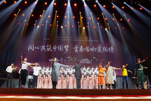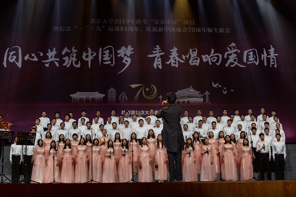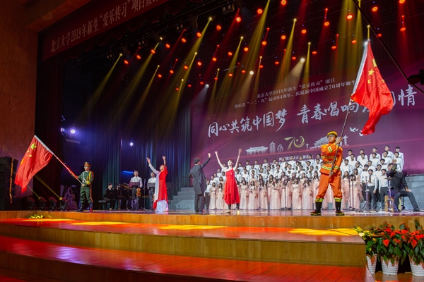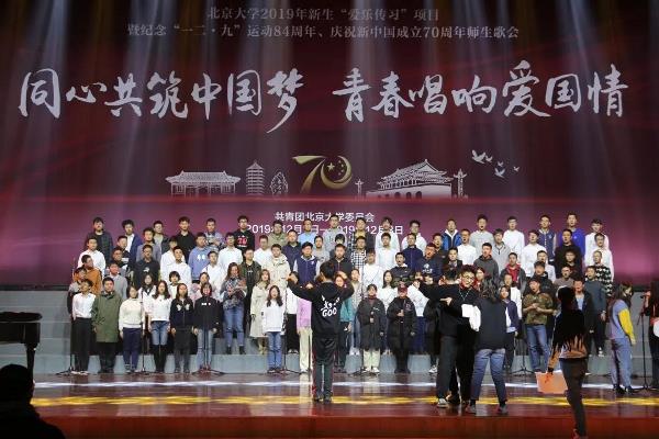 回顾今年的“一二·九”,有太多的故事值得回忆。从十月初接到校团委通知开始,全院师生就行动起来,学院党委大力支持,团委牵头负责,19级新生作为合唱主力。从编曲排练、器乐伴奏,到舞台表演、视频拍摄,无不凝结着城环师生的爱国情与创造力。 我们的歌声在逸夫贰楼、英杰交流中心、新太阳学生中心、对外汉语教育学院先后响起,而今天终于在百年纪念讲堂唱出对祖国的热爱。学院党委团委老师、班主任、辅导员和新生们一起参与训练、共同登台表演。 我们记得逸夫贰楼里初拿曲谱时的茫然,也记得新太阳学生中心初次合拍时的惊喜;我们怀念排练疲惫时老师们送来的的糖葫芦,更怀念印着城环院徽的生日蛋糕;我们看着彼此定妆的脸颊放声欢笑,更在踏上百讲舞台那一刻狂歌竞夜,留下了属于自己的感动。 在新中国成立70周年之际,城环师生以歌唱的方式诉说着爱国之情。“一二·九”师生歌会不仅是一次合唱比赛,更是一次爱国主义教育,是属于19级新生的重大活动。《国家》和《我爱你中国》的旋律成为了专属于城环19级的独家记忆。