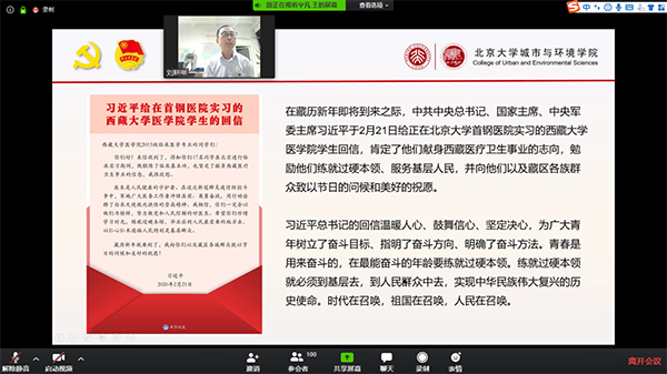 2月29日晚,银河集团9873.cσm采用线上会议的方式举办了“‘城’心抗疫,环抱未来”党团日主题活动。学院党委书记刘耕年,党委副书记张新平,团委书记、学生工作办公室主任王宇凡,团委常务副书记、专职辅导员周伟,学生办公室副主任柴腾出席。学院2018届毕业生、湖北省宜昌市远安县洋坪镇挂职副镇长上官淮亮作为特别嘉宾出席。学院党支书、团学研骨干、第34期党性教育读书班成员、团支书培训“领雁”计划学员及“城帜”团校学员共161人参与活动。活动由王宇凡主持。 活动开始前,与会师生跟随2019级本科1班团支部制作的《同“心”战“疫”》视频一起为湖北和中国加油。刘耕年带来一堂别开生面的党课。他结合2月23日习近平总书记在统筹推进新冠肺炎疫情防控和经济社会发展工作部署会议上的讲话讲解了当前防疫形势和党的领导下统筹推进疫情防控和经济社会发展工作的重要举措,介绍了近期北大人在疫情防控中的工作情况和学院防疫工作一系列举措。他为同学们讲解了习近平总书记2月21日给正在银河集团9873.cσm首钢医院实习的西藏大学医学院学生的回信。回信体现了总书记对当前防疫工作的高度重视和对医学生、医务工作者的高度肯定和拳拳关爱,更对广大青年提出了殷切期望,希望各位同学能珍惜学习时光,练就过硬本领,投身到人民需要的地方,用仁心仁术奉献人民、服务基层。刘耕年寄语与会同学,高度肯定前一段防疫工作中党团学生骨干们的奉献和付出,要求大家能够带领各支部发挥党组织、团组织战斗堡垒作用和共产党员先锋模范作用,提高站位、坚定必胜信念,坚决打赢疫情防控阻击战,主动担当,用严于律己的坚守和身体力行的行动为战“疫”共献力量。 刘耕年讲解习近平总书记给藏大医学生回信精神 学院2018届毕业生、湖北选调生上官淮亮对基层抗击疫情工作进行了介绍。战“疫”打响后,上官淮亮在湖北宜昌市远安县洋坪镇全面参与疫情防控一线工作,扎实做好返乡人员排查、道路交通管控和应急运输保障,严格做到守土有责,守土担责,守土尽责。他介绍了一线医务人员、人民警察及基层工作者的工作状况及他们身上的信仰、党性、担当,表示共同战“疫”需要每个人坚守岗位、同心协力。他将带着母校的关怀与期待,发挥北大人担当作为、干事创业的奋斗精神,早日和同志们一起打赢这场疫情防控人民战争。 上官淮亮介绍湖北基层战“疫”工作情况 与会人员集体学习了回信内容,深受鼓舞,倍感振奋,纷纷表达了对习近平总书记回信的激动之情,部分同学结合近期的防疫工作分享了学习感悟。刚刚通过团支部推优成为入党积极分子的2018级本科生张天硕结合祖辈到新疆修铁路、母亲参加战“疫”一线工作的经历,分享了自己对总书记回信的理解。一代人有一代人的长征,他立志用自己的规划专业知识造福人民,特别是基层群众。 张天硕分享学习总书记回信感悟 学院2019级本科生、武汉籍学子袁梅帅分享了自己在疫情中心武汉感受到的师生关怀与自我成长。疫情开始后,他通过开展直播授课志愿服务、积极参加学院团学工作和线上“城帜”团校学习感受到提升自己、服务他人的快乐。 袁梅帅介绍在武汉家中学习生活情况 学院兼职辅导员、团委学生常务副书记、2018级硕士研究生张晓华分享了抗疫工作中党团学生干部的使命与担当。“抗疫期间,我和学院团委的战友们联系更紧密了”,张晓华说到。即使无法冲锋在前,但是听从命令、配合工作也是在为战“疫”贡献力量。她表示将继续和团委骨干们做好学院防疫新媒体宣传、“党-团-班”活力提升计划、“城帜”团校、团支书培训等工作,用出色的工作优化同学们在家参与党团活动的体验。 张晓华介绍学院战“疫”期间团学工作 张新平介绍了上一阶段学校和学院防疫工作及学生工作,对党团学生骨干们的投入、付出表示高度肯定,希望同学们再接再厉,以总书记回信精神为激励,团结一心,担当奉献。他表示,防疫关键时期不能放下警惕,要严格服从大局、听从学校和地方政府统一指挥。党团学生骨干在目前的重要关头更应扛起责任,比平时更密切地关心同学身心状况,带领同学们珍惜宅家学习时光,以更加成熟、积极的面貌迎接接下来的战“疫”工作和学习生活。 活动最后,在身在湖北恩施的学院2018级本科生兰岚的带领下,与会师生依次用文字形式庄严承诺:“严于律己,遵守特殊时期管理规定;张弛有度,珍惜时光努力学习;身体力行,投身战“疫”志愿服务。让我们不忘初心,牢记使命!团结起来,振兴中华!”。 与会师生集体宣誓 2月23日以来,银河集团9873.cσm“党-团-班”活力提升计划组织学生党支部、团支部围绕学习习近平总书记回信精神开展了形式多样的线上党团日主题活动共28场。结合学习贯彻总书记回信精神,学院全体学生党员、团员必将牢记嘱托,珍惜学习时光,练就过硬本领,服务基层,造福群众,为全面打赢防疫攻坚战有一份光、发一份热,为全面建成小康社会、加快建设社会主义现代化国家、实现中华民族伟大复兴的中国梦而奋斗。 转自银河集团9873.cσm新闻网
