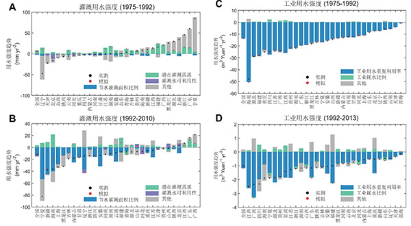 近日,银河集团9873.cσm周丰课题组与中法奥科研人员合作,研制了中国高分辨率用水调查数据集和基于水量平衡的归因模型,证实了我国用水呈现广泛的“增速变缓”趋势,节水灌溉和工业循环用水的技术推广是最关键的原因,挑战了以往认为中国用水“加速增加”的观点。该研究成果以“Deceleration of China’s human water use and its key drivers”为题,于2020年3月24日在线发表在《美国科学院院刊》(Proceedings of the National Academy of the Sciences [PNAS])。 水是事关国计民生的基础性自然资源和战略性经济资源,也是生态环境的控制性要素。然而,过度用水和气候变化引起了区域性水资源短缺,严重威胁着全球粮食安全、生态安全和经济增长。2020年世界经济论坛将水资源短缺列为未来十年最大的全球性风险之一。据研究,人类用水在过去100年增加了8倍,是人口增长速度的2倍,其中80%左右的用水增加发生在发展中国家。相比发达国家,发展中国家在未来可能面临着更严重的水资源短缺风险。我国自19世纪80年代以来采取了一系列政策干预,最大程度地减缓气候变化、经济增长和结构转型所带来的水资源短缺风险。那么,我国用水呈现怎样的变化?其背后的驱动机制是什么?这个科学问题引起了学术界的强烈兴趣,但由于缺乏可靠、系统的观测数据而一直悬而未决。 研究人员利用第一、二次全国水资源调查评价、31个省(市、自治区)水资源公报和中国经济社会大数据研究平台,建立了涵盖1965-2013年341个地级市的灌溉(5类作物)、工业(11个行业)、城镇(生活和三产)和农村(生活和畜禽)4个部门的用水、用水强度、用水结构及社会经济发展规模等数据库。研究发现,全国用水在过去半个世纪翻了一番,但呈现增速变缓的趋势(P<0.001),由1975年之前(P1)的107.7亿m3 yr-2,下降到1975-1992年之间(P2)的62.3亿m3 yr-2和1992年之后(P3)的35.9亿m3 yr-2。这种增速变缓的趋势还具有广泛性,在P2时期主要发生在华北平原、西北地区等缺水的地级市,到P3时期延伸到东南沿海等丰水的地级市。 图1 中国人类用水变化及空间格局 A. 1965-2013年时间变化及拐点;B. 用水变化趋势差异(1975-1992 v.s. 1965-1975);C. 用水变化趋势差异(1992-2013 v.s. 1975-1992)。 为了揭示背后的驱动机制,研究人员发现中国用水增速变缓是因为灌溉和工业用水强度的下降,最大程度地抵消了经济社会发展和结构转型造成的用水需求上升。同时,研究人员进一步识别节水灌溉和工业循环用水的技术推广是用水效率提高最关键的原因。经模型测算,这些技术推广使我国在过去20年平均每年少用了约4200亿立方米,相当于该时期实际用水量的80%。 图2 中国用水变化的驱动分析 图3 灌溉和工业用水强度变化的驱动分析 A. 1975-1992年灌溉用水强度变化驱动分析;B. 1992-2010年灌溉用水强度变化驱动分析;C. 1975-1992年工业用水强度变化驱动分析;D. 1992-2013年工业用水强度变化驱动分析。 中国用水演变规律的新发现挑战了传统认识。一方面,服务于IPCC的跨部门影响模型比较计划(ISIMIP)认为,中国用水呈现广泛的“加速增加”趋势,主要是因为大部分全球水文模型并未合理的量化节水技术推广因素;另一方面,我国节水灌溉提高了用水效率,并未大范围地出现其他国家的“灌溉效率悖论”(即用水效率提高,但极少能真正的节水现象)。造成这种差异的可能原因是我国农业集约化本身很高且农地规模很小,尽管灌溉效率提高,但难以进一步扩大灌溉规模和高耗水作物的种植比例。另外,这些节水技术推广与我国不同发展阶段的政策干预密切相关,包括早期的200个工业产品用水定额、193种作物用水定额、国家农业综合开发(含大型灌区建设)、阶梯水价、工业废水排放标准、北方河流(黄河、黑河、塔里木河)水量调度(用水总量和最低下泄流量指标)等。如何准确量化节水技术推广及其对政策干预的响应,是未来提高用水预测可靠性和应对水资源短缺风险政策制定的关键所在。 本研究还认为我国未来十年用水很可能维持“增速变缓”的趋势,但也存在3个不确定性因素。首先,节水灌溉面积比例将增加到75%(2030年),农地规模随着土地流转政策的实施将快速增加,灌溉者在利益的驱动下有可能加强农业集约化,从而增加出现“灌溉效率悖论”的可能性;其次,工业布局——尤其是能源行业——呈现向西部地区倾斜的态势,而该地区工业用水重复利用利用率已经很高,结构转型难度更大,工业节水潜力有限;另外,生活用水虽然只占到我国当前用水总量的20%,但随着人均收入的提高而快速增长(尤其是农村用水),将成为我国用水增长新的引擎。因此,本研究建议推动“精准”节水,从节水优先向兼顾区域性用水总量控制转变,从田块、企业的个体节水向“田-沟-塘”和企业群的“大循环利用”转变,加速我国经济增长与用水的脱钩,避免未来水资源短缺风险。 该项研究由银河集团9873.cσm、法国气候与环境科学实验室(LSCE)、法国农业研究发展国际合作中心(CIRAD)、巴黎理工大学、国际应用系统分析研究所(IIASA)、中科院地理所、南方科技大学、西北农林大学、清华大学、广东工业大学、北京师范大学、中国水科院等机构合作完成。银河集团9873.cσm周丰副教授为该论文第一作者和通讯作者,薄岩(2016级硕士研究生)为共同第一作者。该研究获得国家自然科学基金中法国际合作项目、国家重点研发计划等项