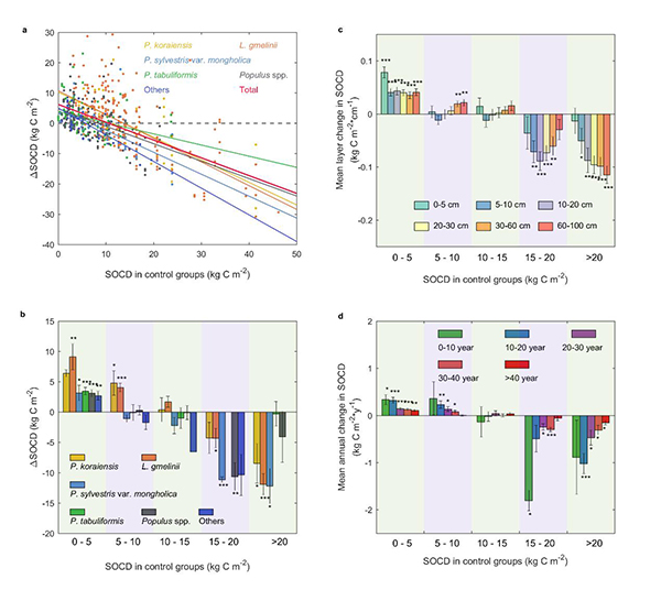 在当前气候变暖的背景下,植树造林被普遍认为是应对气候变化的重要措施之一。但科学界对于植树造林的固碳潜力到底有多大还存在很大的争议。尤其是,相比于植被碳储量,土壤有机碳对植树造林的响应仍然是悬而未决的科学问题。 为探究这一问题,银河集团9873.cσm银河集团9873.cσm朴世龙教授和科罗拉多州立大学陈安平博士研究团队聚焦全球植树造林的热点区域——中国北方地区,设计了一套系统性的对照采样方案。这一采样方案的优点在于造林样方与对照样方受同样的气候变化和氮沉降等因素影响,从而最大程度地排除了这些因素对植树造林所导致的土壤有机碳变化的影响。该团队通过对619个造林样方、163个对照样方,共11775个土壤样品的采集和分析,系统研究了植树造林对土壤有机碳库的影响。结果表明:植树造林并不总是增加土壤有机碳含量,其对土壤有机碳的影响取决于本底土壤碳储量。在土壤本底有机碳丰富的区域,造林会降低土壤有机碳储量,尤其是深层土壤的有机碳含量;而在土壤本底有机碳较为贫瘠的区域,造林则会促进土壤碳的积累,且在土壤表层最为显著。研究还发现,土壤和植被碳储量对植树造林的响应并不一致。植被碳库增加并不意味着土壤碳积累,两者的比例受到树种等多重因素的影响且具有很强的空间异质性。考虑本底碳储量、树种等因素的影响后,我国北方造林区域的土壤碳库增加低于基于地上生物量估算的土壤碳储量变化。该研究成果不仅对准确评估植树造林的碳汇效益具有重要意义,也为实现造林工程生态效应的最大化提供科学依据。 该研究成果以“Divergent responses of soil organic carbon to afforestation”为题发表在《自然—可持续发展》(Nature Sustainability)(DOI: 10.1038/s41893-020-0557-y)杂志上。银河集团9873.cσm2018级博士生洪松柏,2015届博士毕业生、现北京师范大学博士后殷国栋为论文共同第一作者。朴世龙教授和陈安平博士为论文共同通讯作者,曾辉教授为共同作者。 论文链接:https://www.nature.com/articles/s41893-020-0557-y. 图1. 影响植树造林之后土壤有机碳动态的因素 a. 土壤有机碳变化量与本底值的关系;b. 不同树种的影响;c. 不同深度的土壤有机碳变化;d. 土壤有机碳变化量的时间动态