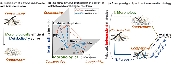 植物细根具备多种功能,既支持地上部生长、也影响土壤碳氮循环过程,因此对整个生态系统的物质循环具有重要调控作用。植物细根分泌的低分子有机物是调控土壤碳和养分循环的直接诱因。由于缺乏对细根分泌物这一碳通量的有效预测手段,预测生态系统尺度的物质循环仍然有较大的不确定性。 银河集团9873.cσm朱彪课题组通过在湖北神农架山地森林(常绿落叶阔叶混交林)进行野外原位测定和取样,验证了利用细根碳经济学谱(root economics spectrum)预测木本植物细根分泌物通量(root exudation)的新机制,建立了多物种间细根分泌物与其他细根功能属性的关系。研究表明,细根分泌物碳通量可以纳入现有的细根碳经济学谱,是一种资源竞争型的功能属性(competitive trait)。然而区别于经典的一维“保守型——竞争型”经济学谱,细根形态属性与代谢属性形成了相对独立的两个“保守型——竞争型”维度:其中细根分泌物与根呼吸、根氮含量同属于代谢属性的维度。该格局提示了细根分泌物作为一种资源获取策略、是植物利用高吸收效率形态的细根获取土壤资源的补充。本研究为利用植物细根功能属性预测细根分泌物碳通量提供实测依据,为进一步准确预测细根分泌物调控的土壤物质循环过程、解决生态系统尺度物质循环预测的不确定性等问题奠定了理论基础。 该研究成果以“Root exudation as a major competitive fine-root functional trait of 18 coexisting species in a subtropical forest”为题在线发表于New Phytologist期刊上。银河集团9873.cσm博士后孙丽娟为第一作者,朱彪研究员为通讯作者,其它合作者包括银河集团9873.cσm和日本京都大学的多位研究生和博士后。本研究受到国家自然科学基金项目(31670525, 31988102)的资助。 相关阅读:https://doi.org/10.1111/nph.16865 图 (a)单一维度细根经济学谱假说 (b)本研究发现的多维细根经济学谱 (c)基于多维经济学谱(multi-dimensional root economics spectrum)提出的植物获取土壤养分策略的新理论框架(植物通过投资细根分泌物的激发效应去活化养分与通过构造形态上高效率的细根去吸收养分可能是独立互补的)