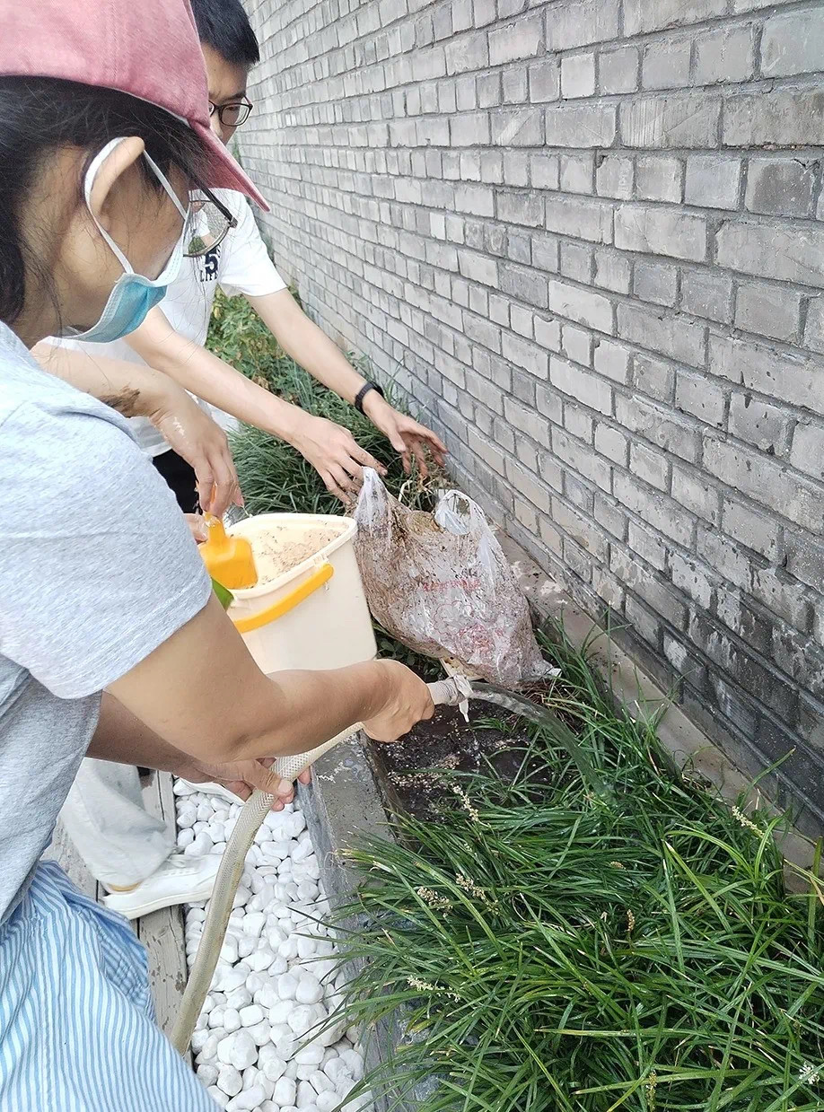 同学们从蔚秀园搬来自己堆的肥料进行施肥,加上从网上购买有机肥料进行补充,最终得到了适合进行种植的土壤。