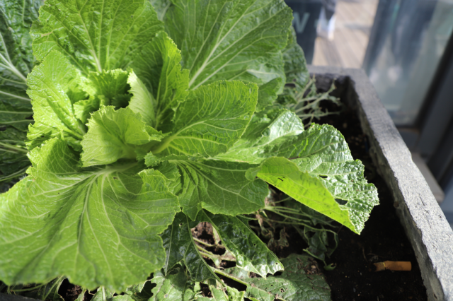 夏末之时,天气炎热,降水稀少,白菜面临着干旱的威胁。“林歌”计划的志愿者们虽每周都对白菜进行浇水,但由于大家缺乏经验,浇水的次数虽然足够,每次的水量却不到位。生长在露台南侧的白菜受到强烈光照,蒸腾作用较大、缺水严重,长势不太乐观。与此同时,白菜上还出现了许多青虫,而它们的天敌——鸟类不敢靠近露台,虫害便容易发生。