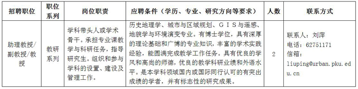 一、 招聘范围 海内外公开招聘 二、招聘岗位 三、 应聘材料 候选人个人申请;候选人详细履历和CV(包括个人基本情况、教育和工作经历、教学和研究陈述、发表列表等);候选人的博士学位证明扫描件;3-5篇第一作者的代表作;申请预聘职位(助理教授或预聘副教授)的,提供不少于3封国内外专家推荐信(含校内同行推荐信)。请将以上材料发送至liuping@urban.pku.edu.cn,主题注明"应聘专业+姓名",内容请写明拟应聘的职位。