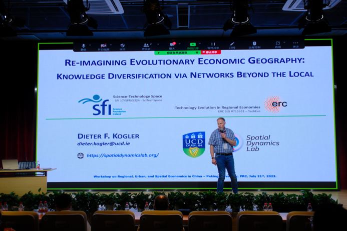 都柏林大学Dieter F. Kogler教授作题为“重思演化经济地理学:通过非本地网络实现知识多样化(Re-imagining Evolutionary Economic Geography: Knowledge Diversification via Networks beyond the Local)”的主旨报告。他首先评述了演化经济地理学当前趋势,并构建了包含网络动态视角的理论框架。在此基础上,他重点关注了可能极大重塑区域当前发展路径的“非本地网络”,并介绍了相关实证研究。相关研究为多区位企业内部知识流动促进区域技术多样化提供了经验证据。