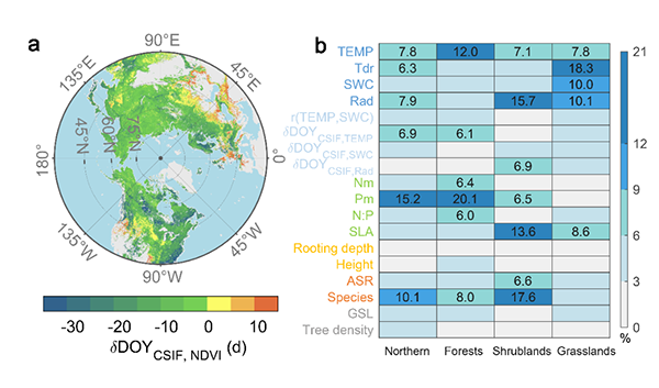 图1. 北半球植被光合作用和冠层结构季节峰值的时间差异(a,绿色表示光合作用先达峰,黄色表示冠层结构先达峰)和不同因子对时间差异的空间变异的相对贡献(b)