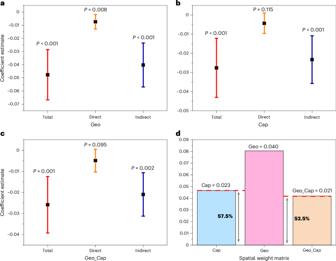 该研究整合了地理学、灾害经济学与网络科学研究框架,通过引入修正权重矩阵的空间计量经济模型,比较了自然灾害在地理空间与经济网络中的溢出效应。研究发现,一座城市虽然会受到地理邻近城市爆发自然灾害的冲击(-0.040单位),但经济联系也会传导来自于其他受灾城市的损失(-0.023单位)。如果仅关注地理邻近因素的作用而忽视经济网络溢出,会导致自然灾害的总经济损失被低估52.5%-57.5%。进一步分析表明,经济网络中接近中心度更高、局部聚类系数更大的城市遭受灾害冲击时,会产生更严重的负面溢出效应。
