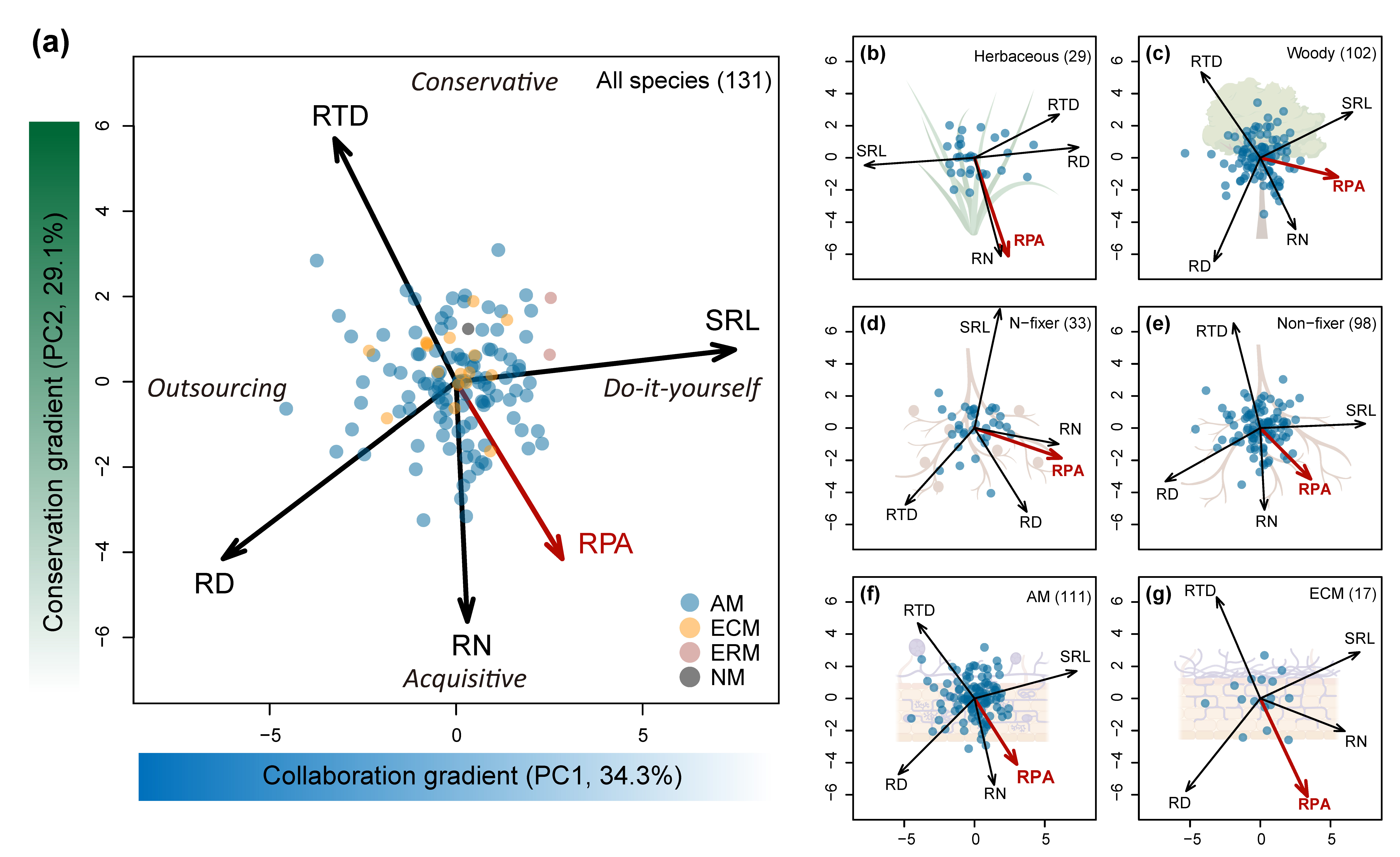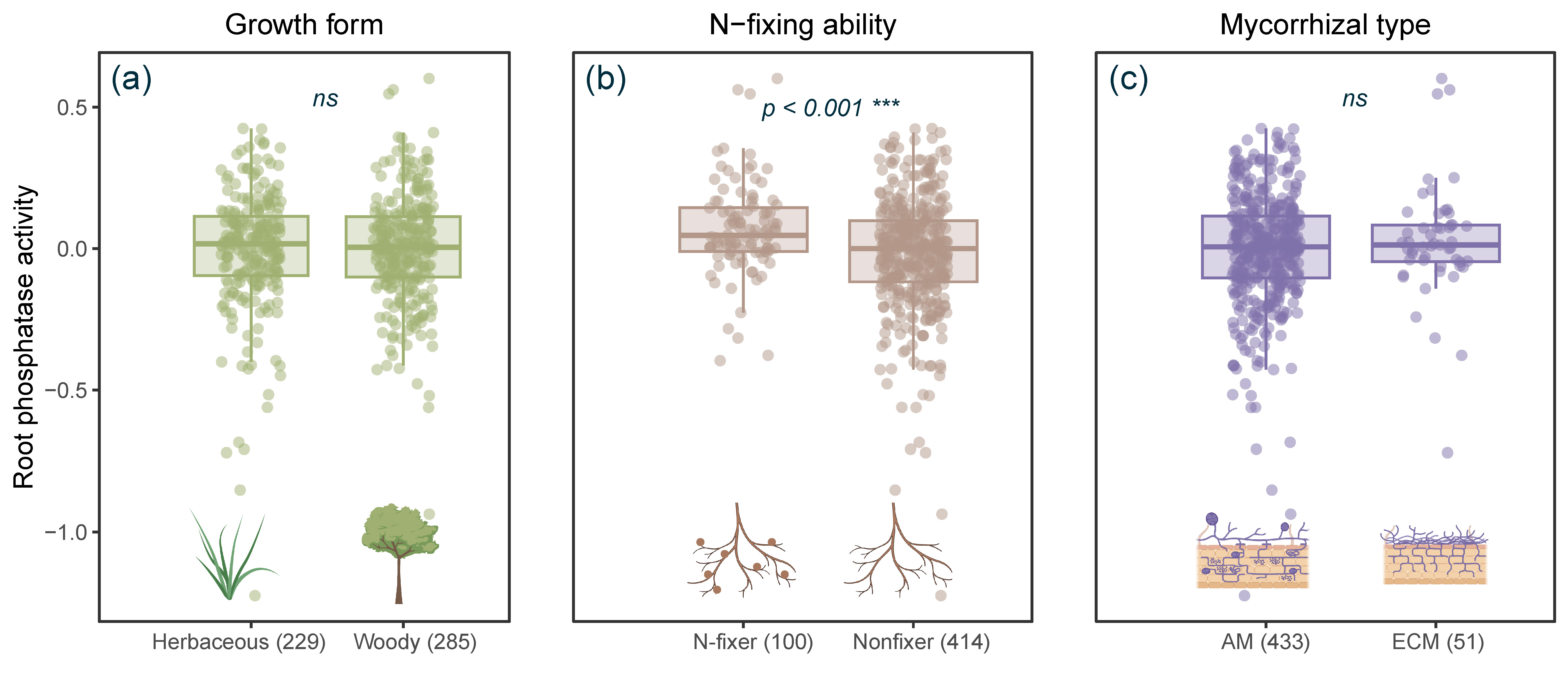 银河集团9873.cσm朱彪教授课题组系统构建了一个包含全球83项研究、涵盖514个物种的细根磷酸酶活性数据集以回答上述科学问题(图1)。首先,研究发现细根磷酸酶活性在生活型间(草本、木本)和菌根类型间(丛枝菌根、外生菌根)均没有显著差异。然而,固氮植物细根磷酸酶活性显著高于非固氮植物(图2)。其次,本研究结果验证了细根性状主要沿两个独立维度变化,即二维“细根经济空间(Root Economics Space, RES)”。一个是以组织密度和细根氮含量为代表的“保守”维度(Conservation gradient),主要刻画细根资源获取能力;另一个是以细根直径和比根长为代表的“合作”维度(Collaboration gradient),主要刻画资源获取方式。本研究表明,细根磷酸酶活性主要位于“保守”维度的“获取”端,这种模式在不同植物功能群之间普遍存在(图3)。进一步发现,细根磷酸酶活性与比根长、比根面积、细根氮含量和氮磷比正相关,与细根直径、组织密度和细根磷含量负相关,而与细根分支强度、菌根侵染率没有显著关系(图4)。